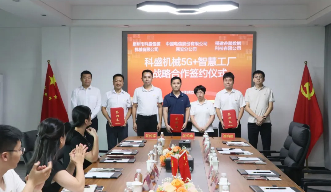 產業是城市經濟的靈魂,城市要變強,離不開產業實力的強大。專注于一件衣、一雙鞋、一片紙、一塊薯片、一個水龍頭,泉州一路走、一路拼,形成了今天的九大千億產業集群,實現了“從無到有,從有到優”的華麗轉身。 食品飲料作為泉州九大千億產業集群之一,眼下,數字化轉型正從不同切入點落地到泉州食品飲料產業、企業的發展進程中。數字化與產業技術之間的結合,讓企業發展迸發出新的火花,讓產業煥發新的生機。 今年8月底,泉州市科盛包裝機械有限公司(以下簡稱“科盛機械”)與中國電信股份有限公司惠安分公司、福建谷器數據科技有限公司簽約“5G智慧工廠”,助力科盛機械發展新質生產力、推進新型工業化,致力于打造惠安縣首個5G+智慧工廠標桿。