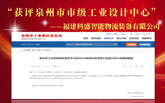 榮耀之光,璀璨綻放 近日,泉州市工業和信息化局公布2024年市級工業設計中心名單。福建科盛智能物流裝備有限公司榮評泉州市市級工業設計中心。